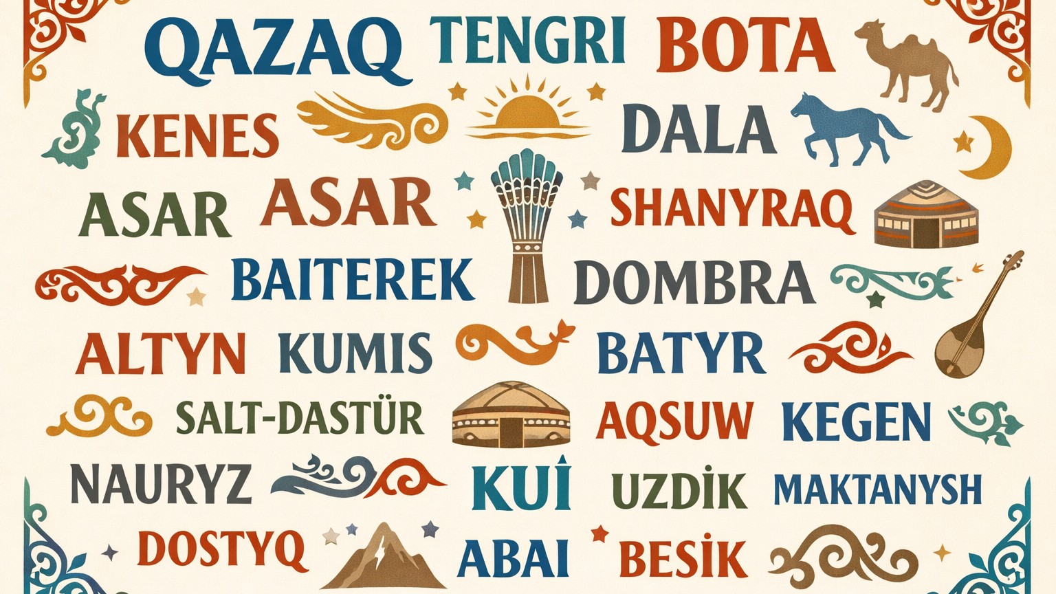 一方で、ウズベク語やトルコ語などの他のテュルク語族と比べると、カザフ語はペルシア語やアラビア語由来の単語がやや少なく、より中央アジア独自のテュルク系の単語がたくさん残っているのも特徴です。